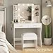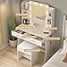 - The size of this dressing table set is 33.5"(L)x15.7"(W)x51.6"(H), it has a spacious tabletop and 2 large drawers that provide the perfect space to store and organize your precious lipsticks, eye shadows, makeup, perfumes, jewelry, other beauty supplies, and more in different places. And comes with a cushioned stool. Wonderful gifts for yourself, your wife, your mom, your girls.