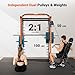 - 【Independent Dual-Pulley System for Multi-Target Training】Our Smith Machine home gym system revolutionizes training with dual 2:1 ratio pulley systems, featuring 4 fixed pulleys and 1 dynamic pulley per side. This engineering marvel delivers silky-smooth independent resistance for lat pulldowns, seated rows, and precision glute sculpting. The anti-shock dynamic pulley technology makes it ideal for both power cage enthusiasts and Smith Machine users seeking quiet, tension-perfect workouts.